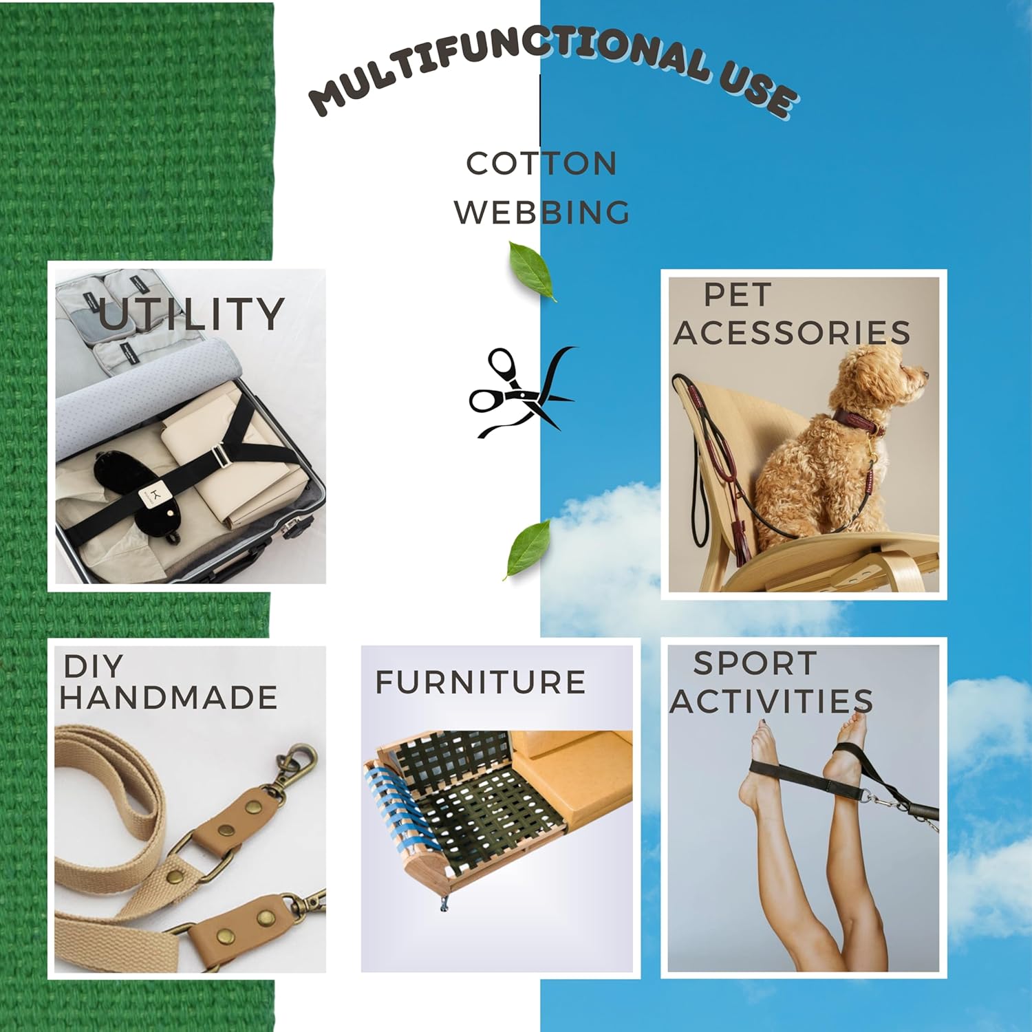 - Width: 2 IN Webbing. Length: 5 YARDS. Colour: Juniper Green. Material: 100% Cotton